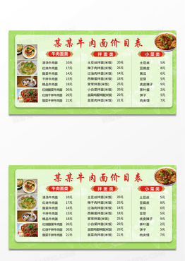 浅绿色简约创意简洁某某牛肉面价目表饭店菜单设计牛肉面价目表展板