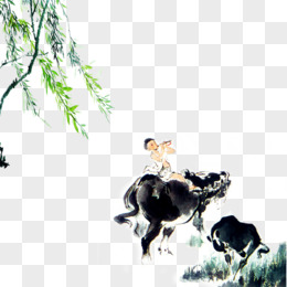 儿童水彩风在牛背上吹笛子的牧童免抠元素