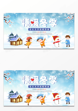 高端蓝色光效冬季冬天促销雪花雪人优惠购物宣传展板设计
