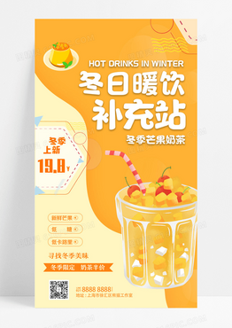 橙色冬日暖饮冬季热饮上新奶茶饮料手机宣传海报设计