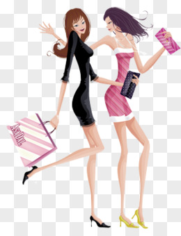 卡通手绘女孩逛街选购衣服场景免抠元素