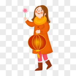 卡通手绘女孩拿灯笼放烟花庆祝元素