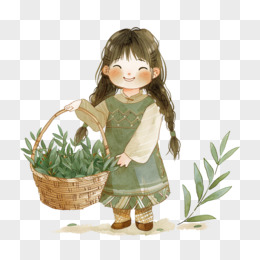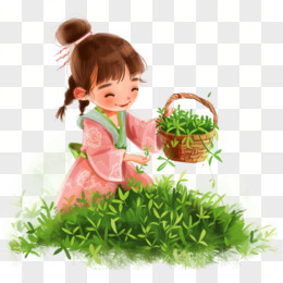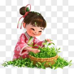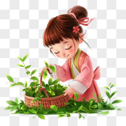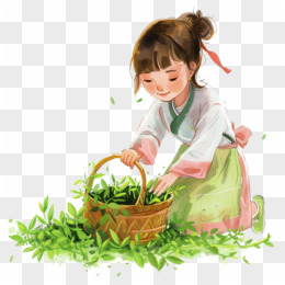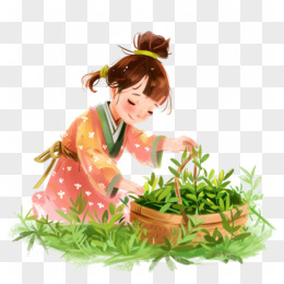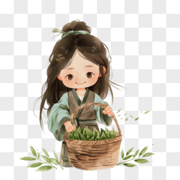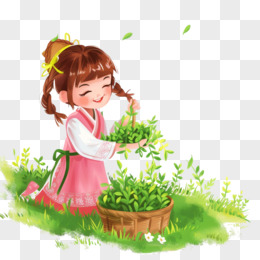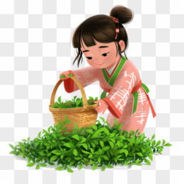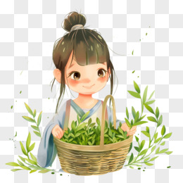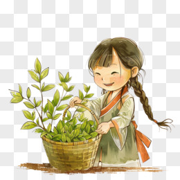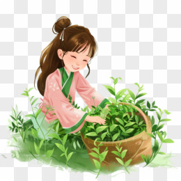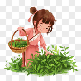 卡通手绘春天开心采摘茶叶的少女免抠元素
