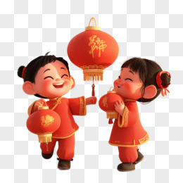 3D卡通新年装饰通用素材两个小女孩提着灯笼免抠元素