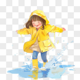 下雨天穿着黄色雨衣开心玩水女孩卡通元素