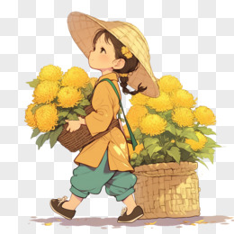 卡通风秋天小女孩背着一竹篓菊花免抠元素
