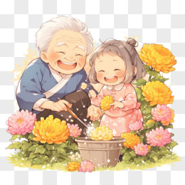 卡通风重阳节一个老奶奶和小女孩在菊花丛中免抠元素
