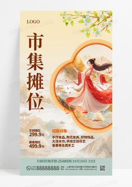 黄色国潮风清新非遗市集古风女绿色渐变手机海报