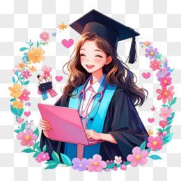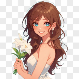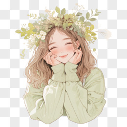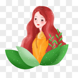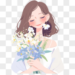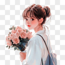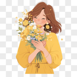 卡通风格花丛中捧着玫瑰花的女性形象免抠元素