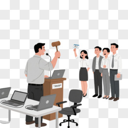 卡通男拍卖员站在大屏幕前举槌拍卖场景免抠元素