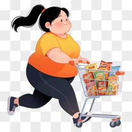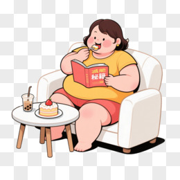 卡通一个胖女孩边吃奶茶蛋糕边看减肥秘籍免抠元素