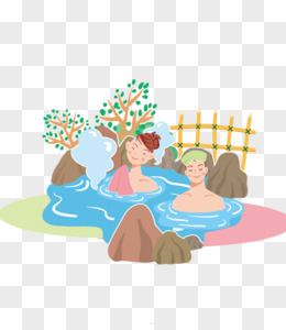 手绘卡通多人泡温泉场景素材