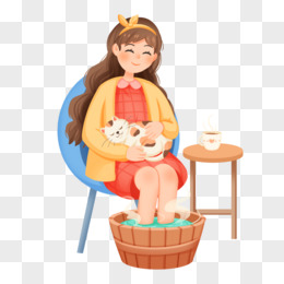 手绘插画居家抱着猫泡脚的女生免抠素材