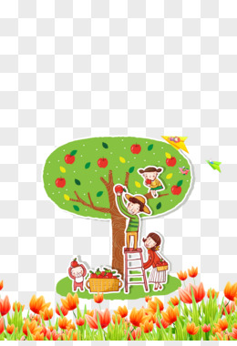 手绘插画小伙伴一起摘苹果元素