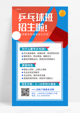 教育培训蓝色简约插画乒乓球班招生啦乒乓球招生培训手机宣传海报