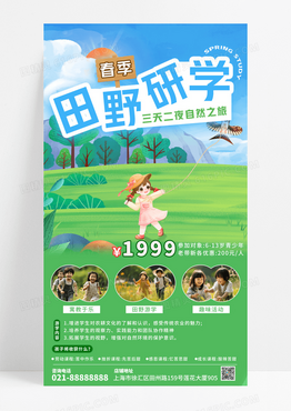 春季研学田野儿童绿色蓝色插画风长图海报ps海报素材