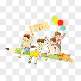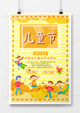 黄色波浪五个小孩气球铅笔简约风矢量儿童节海报