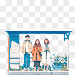 卡通风环保低碳出行方式三个人在公交站等公交车免抠元素