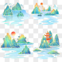 一组卡通中式青绿山水套图合集元素