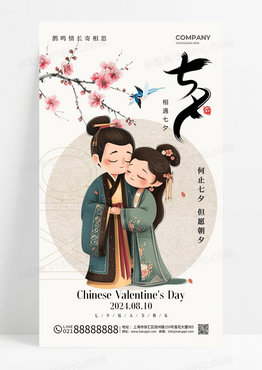 卡通风七夕一对爱心丝带围绕的古风情侣免抠元素