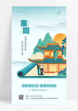 青绿色简约插画九九重阳节农历九月九日传统节日手机海报