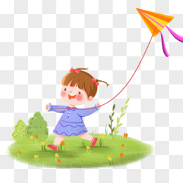 手绘卡通女孩在郊外放风筝素材