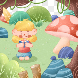 卡通手绘女孩在郊外看书素材