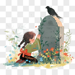 平面插画母女拿着黄色菊花在墓碑前祭祀免抠元素
