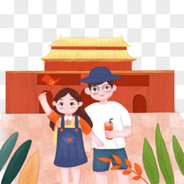 手绘插画风夫妻国庆旅游自拍元素