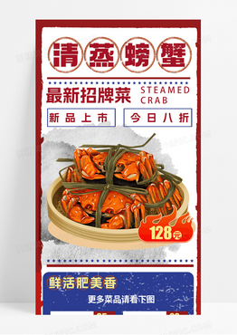 红色扁平卡通餐厅美食螃蟹招牌菜推荐手机长图手机海报