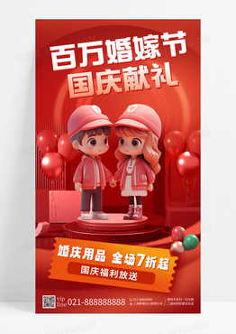 红色气球百万婚嫁节国庆献礼婚庆用品福利放送手机海报