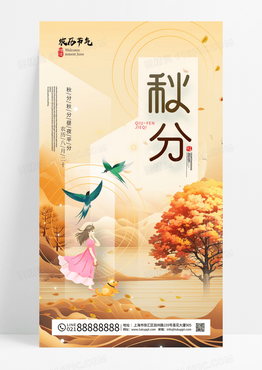 秋分之手绘卡通女孩拿着银杏叶奔跑