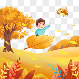 手绘卡通立秋女孩坐在落叶上插画元素
