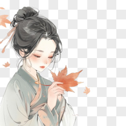 手绘女孩拿着枫叶免抠元素