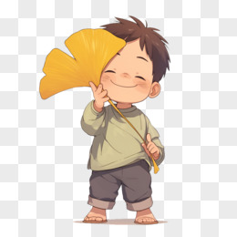 卡通风秋天拿银杏叶的小男孩免抠元素