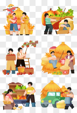 一组创意插画农民秋季丰收收获粮食人物合集元素