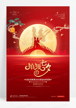 红色唯美浪漫七夕牛郎织女鹊桥相会宣传海报