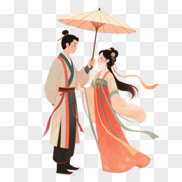 卡通风七夕一对古风情侣撑着油纸伞对望免抠元素