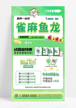 绿色简约麻将馆试营业活动雀麻鱼龙手机海报
