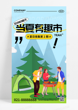 夏日夜市逛夜市蓝色绿色扁平风黑描风海报
