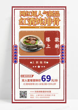 餐饮美食红色复古简约网红超人气新品红酒炖排骨餐饮手机宣传海报