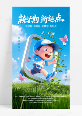 蓝色草地新学期新起点3d人物奔跑开学季海报