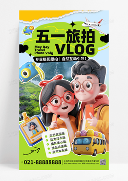 黄色简约拼贴撕纸风五一旅拍vlog摄影人物风景车海报宣传海报