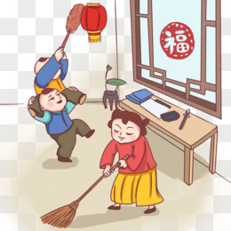 手绘小年除尘打扫房间场景素材