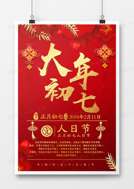 2019年猪年新年大年初七人日节红色喜庆系列宣传海报设计