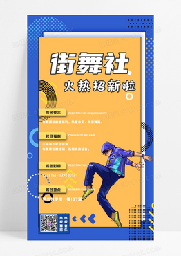 蓝黄色街舞社火热招新啦街舞手机海报街舞UI
