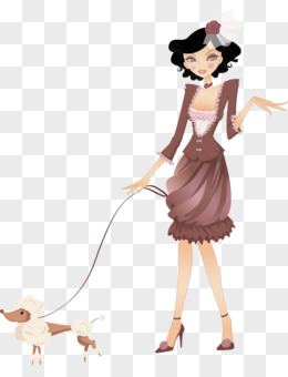 手绘卡通女孩遛狗免抠元素