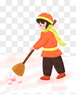 冬天之手绘卡通女孩拿着扫把扫雪地