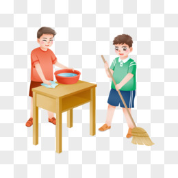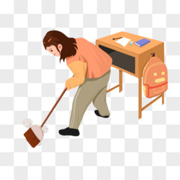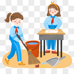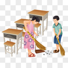 手绘卡通学生在打扫课桌和扫地插画免抠元素