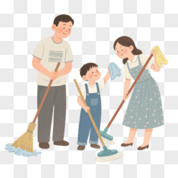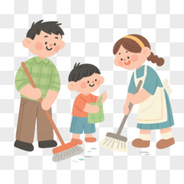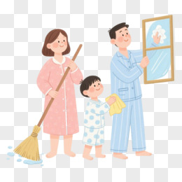 卡通一家三口打扫卫生擦玻璃扫地免抠元素